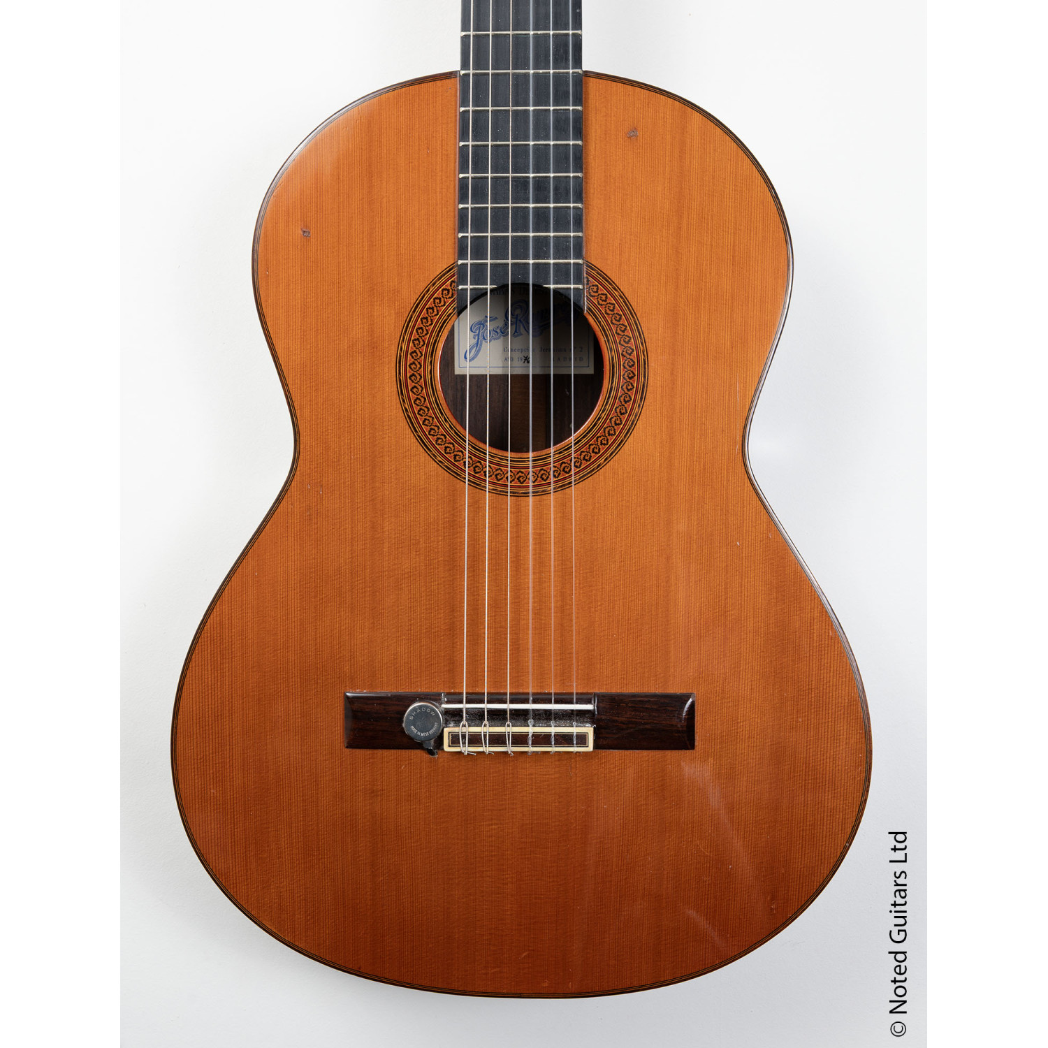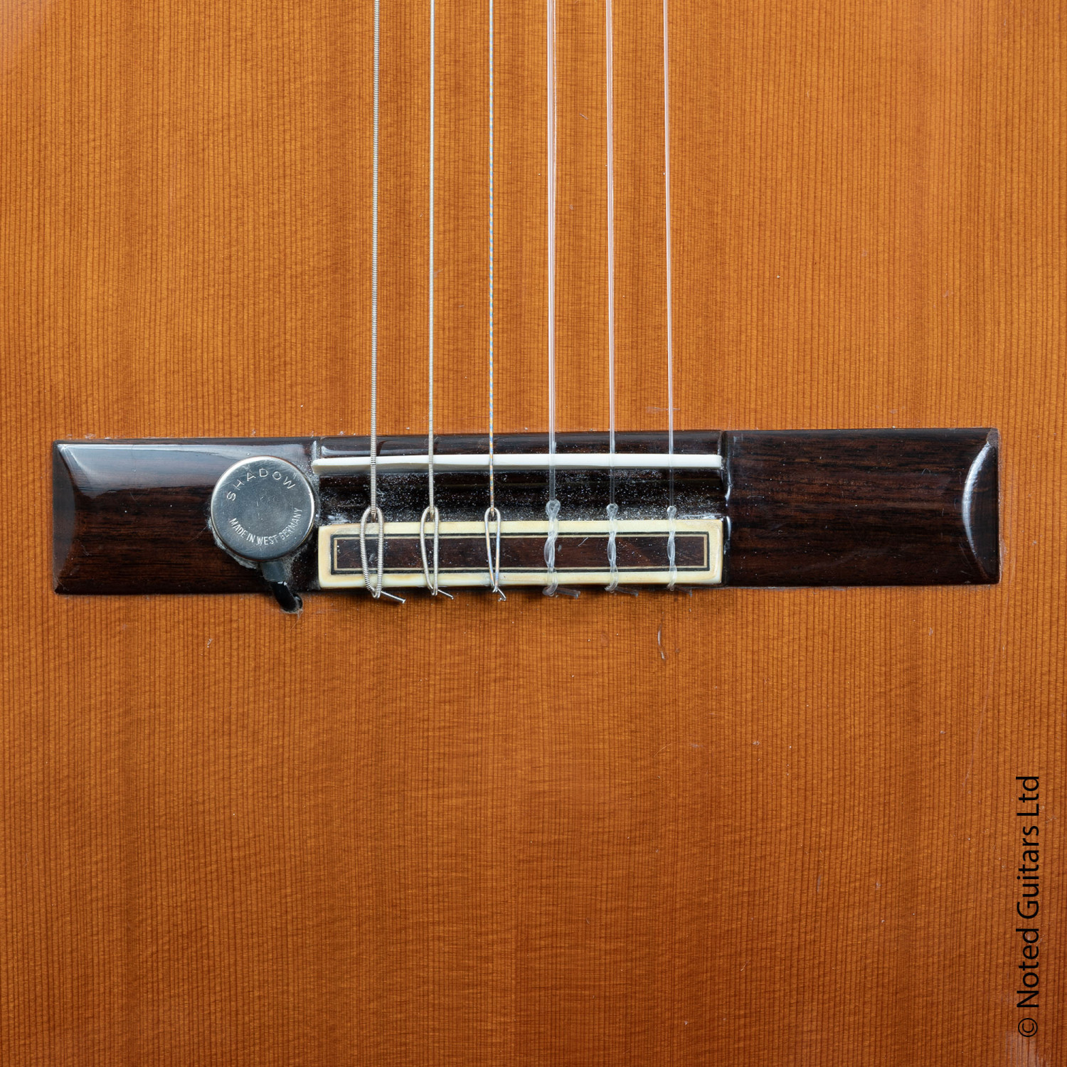 The guitar is equipped with a Shadow contact microphone attached to the bridge. This is marked 'Made in West Germany', and we believe that this was fitted as an option by the Ramirez factory (Ramirez still offers to fit Shadow microphones as an option today). The microphone works perfectly. There is no preamp, so there is no battery anywhere. Any control of volume, EQ, etc needs to be done externally to the guitar.